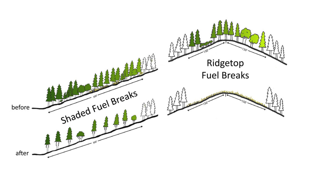 Ridgetop Fuel Breaks Ridgelines concentrate wind-driven fire intensity and serve as natural firebrand launching points. Our ridgetop fuel breaks extend 100-150 feet on either side of the ridge crest, with more aggressive thinning (60-70% canopy removal) to account for extreme wind exposure and ember transport potential. These zones prioritize fire suppression access and create anchor points for backfiring operations during active fire events.
