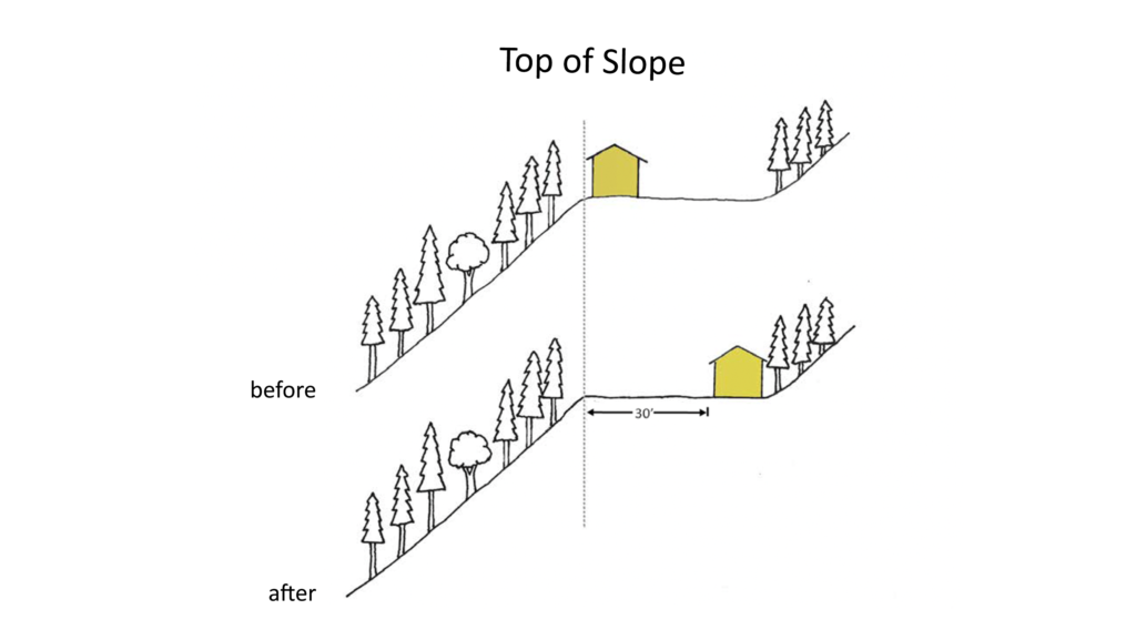 Top-of-Slope Infrastructure Buffers Where buildings occupy ridge or upper slope positions, we establish 100-foot defensible space zones that transition from highly managed (0-30 feet: irrigated, low-fuel landscaping) to moderately managed (30-100 feet: thinned natives, fuel load <3 tons/acre). These buffers account for radiant heat exposure, ember accumulation in building corners, and the reality that upslope fires arrive with maximum intensity. Infrastructure placement prioritizes ridgetop locations specifically to avoid mid-slope fire chimneys and vegetation funnels.